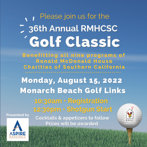 The 36th annual RMHCSC Golf Classic brings together some of our closest friends and partners to celebrate our McDonald’s family and supporters. Together, we support our mission of providing comfort and care to children and families across Southern California. We invite you and your team to join our McDonald’s owner operators and team for a fun day of beachfront golf to help keep families close when it’s most important.