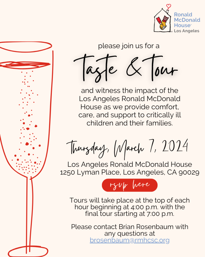 Please join us for a Taste & Tour and witness the impact of the Los Angeles Ronald McDonald House as we provide comfort, care, and support to critically ill children and their families.