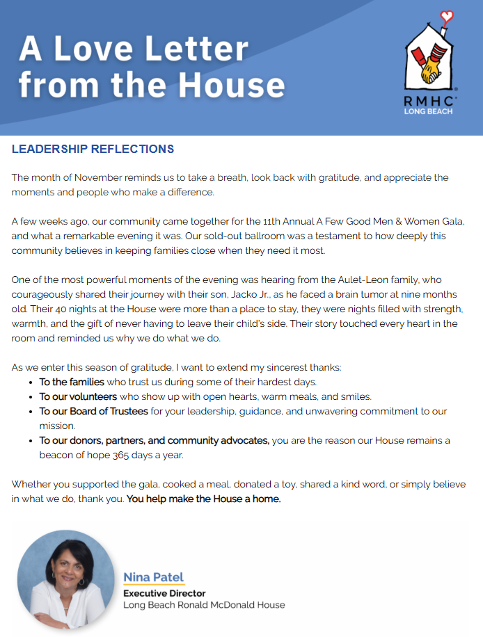 Unifying the efforts of our six houses, a camp, two family rooms and other programs, the Southern California Chapter of Ronald McDonald House Charities is committed to creating a community where children and their families embrace life and healing with a sense of hope, enthusiasm, courage and joy.