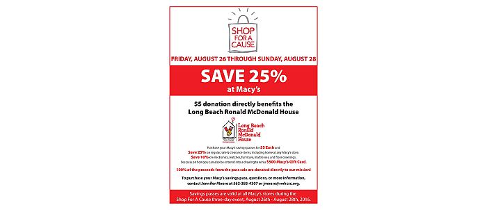 Macy’s Department stores will be holding a special “Shop for a Cause” three-day sale event from Friday, August 26th through Sunday, August 28th.