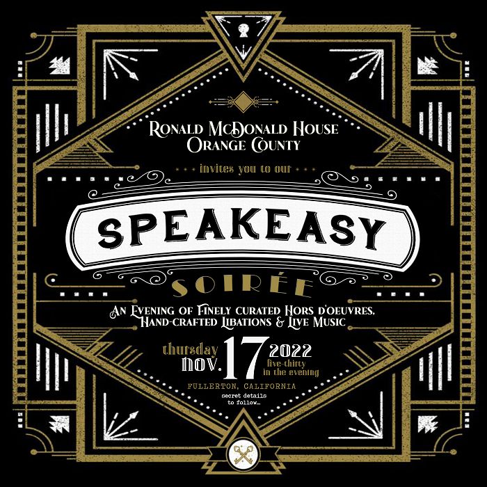 Ronald McDonald House Orange County invites you to our Speakeasy Soiree on November 17th at 5:30pm at a secret location in Fullerton, CA. (location clues to follow) Join us for a night of handcrafted libations, finely curated hors d'oeuvres, live music and more! All proceeds benefit Ronald McDonald House Orange County: providing a “home away from home” for families with critically ill children.