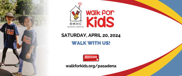 The Walk for Kidsâ„¢ is an annual community fundraiser that supports the children and families who rely on the life-changing services and programs provided by Ronald McDonald House Pasadena.