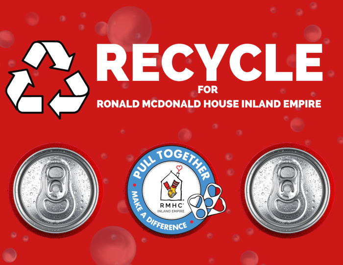 This is a wonderful way to support the Ronald McDonald House Inland Empire and our planet! Items will be recycled, and the funds are used to help support our House and the children and families we serve. If you cannot make the date, don't worry - we accept tabs and cans all year long!
